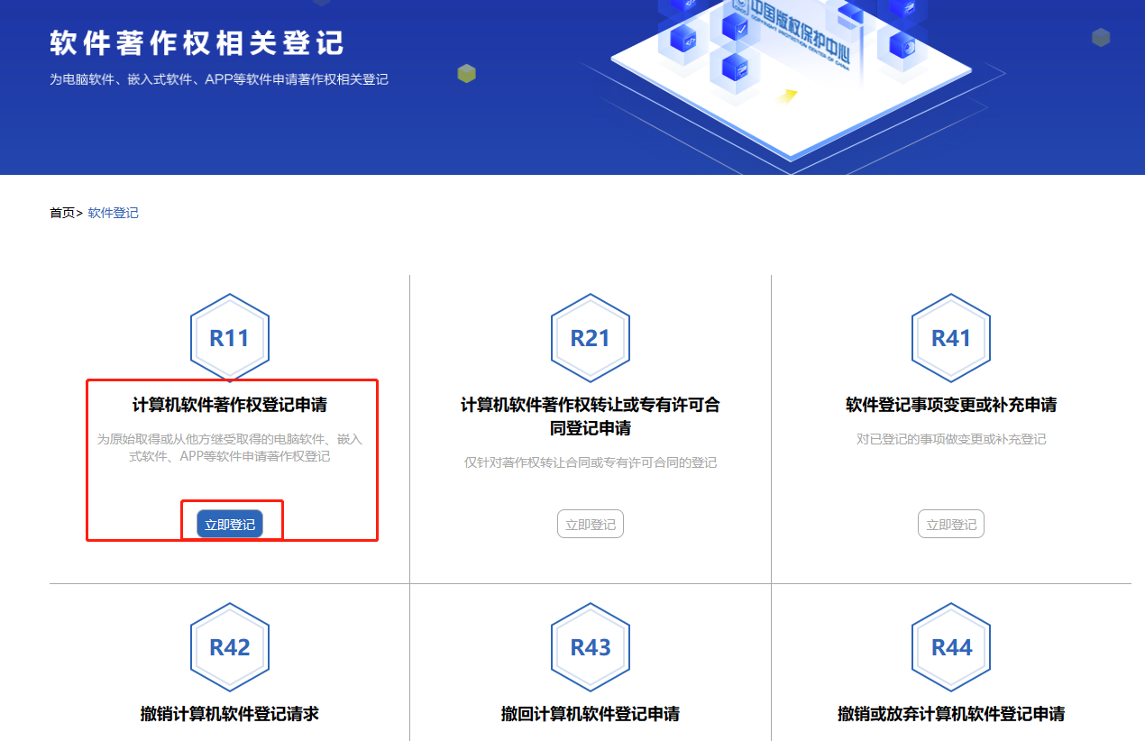 6:选择“计算机软件著作权等级申请”-立即登记