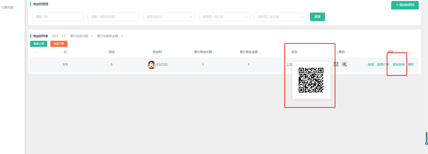 可根据收款码ID、收款码名称、收款码上下架状态、收款码分类快速查找,可查看到收款码累计收款次数、累计收款金额(已完成订单)、查看对应扫码买单订单.