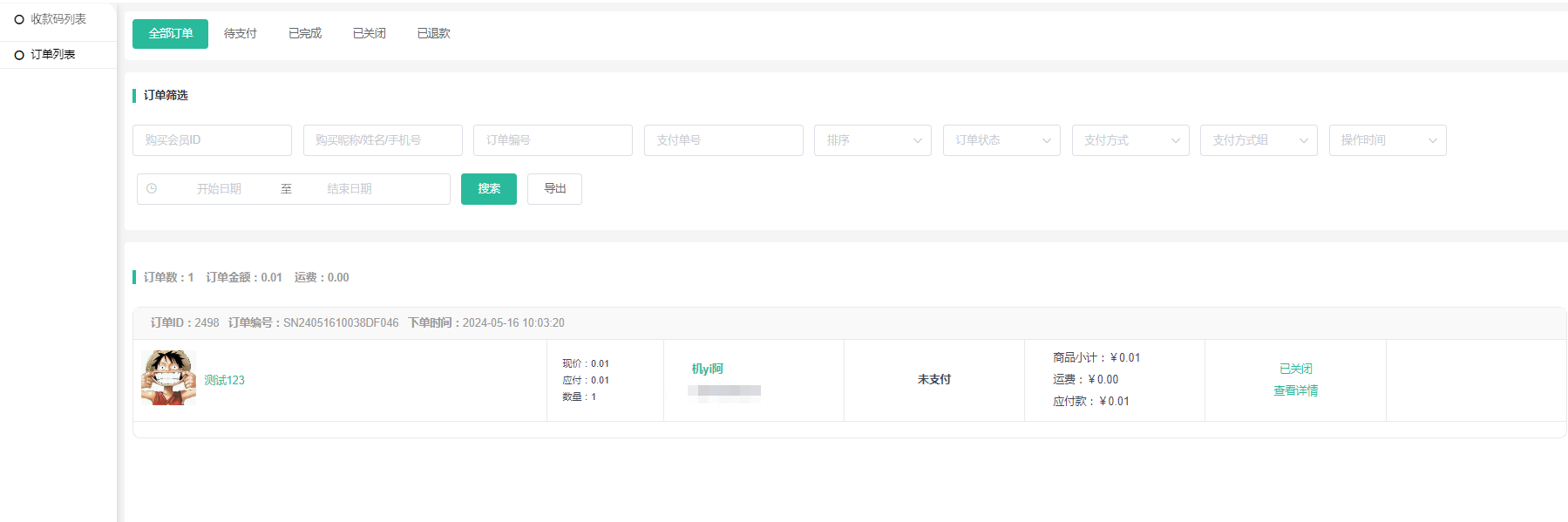 所有收款码订单:待支付、已完成、已关闭、已退款。