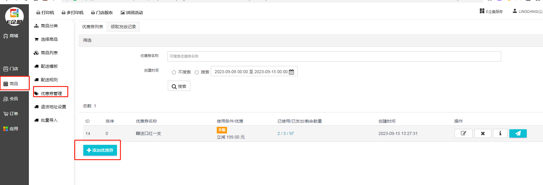 1. 登录门店系统后台,商品--优惠券管理