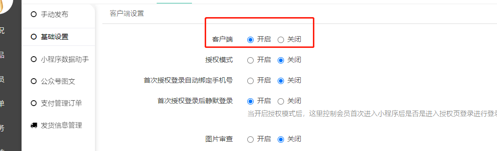 注意:如果是中途开启关闭客户端,前面已有用户访问过小程序商城,因为每个微信小程序都可以有自己的本地缓存,需清理本地缓存,比如删除小程序浏览记录,重新搜索进入才会生效。