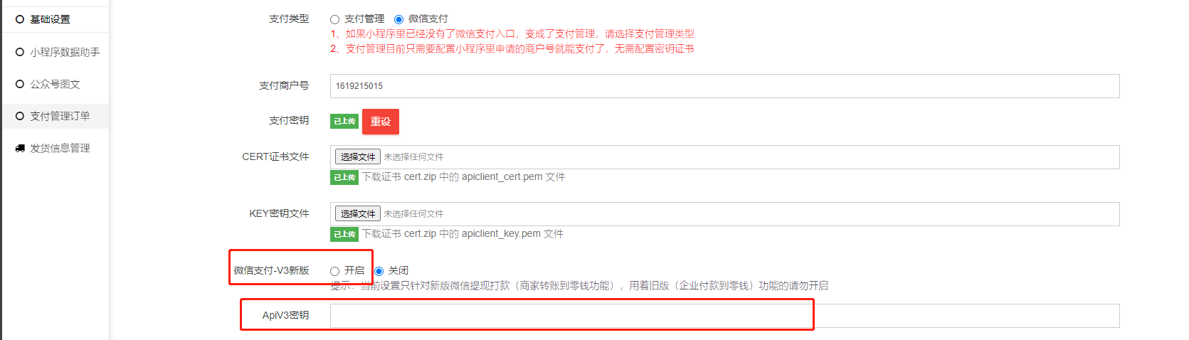 4、微信支付-V3新版:当前设置只针对新版微信提现打款(商家转账到零钱功能),用着旧版(企业付款到零钱)功能的请勿开启,如开通商家转账到零钱功能的,通过小程序提交申请打卡的需要配置好,反之不能进行打款~