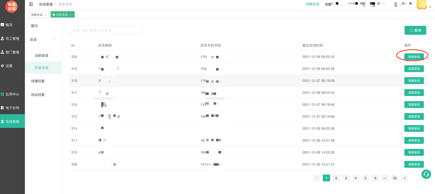 通过历史会话列表可以查看自己所有的历史会话,并支持重新发起会话。