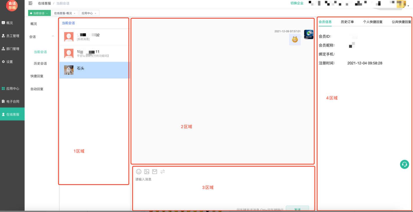 4区域:当前会员数据、订单查看,个人快捷回复、公共快捷回复信息。