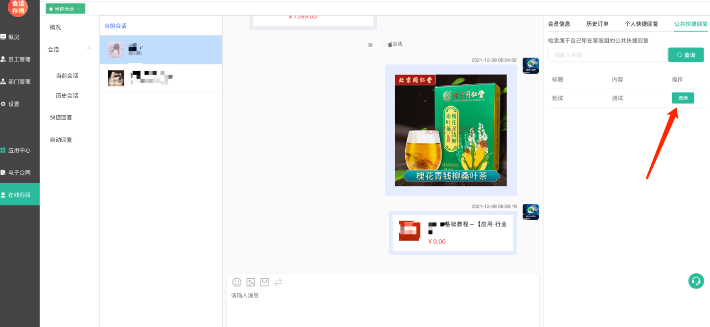 选择快捷回复,可快速发送快捷回复信息